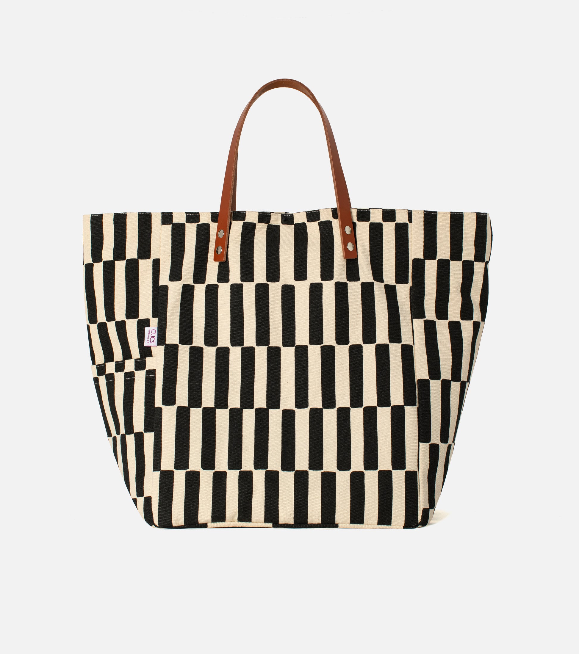 Exterior: tejido algodón 330 gr. estampado; asas de cuero; bolsillo lateral; etiqueta Cucs