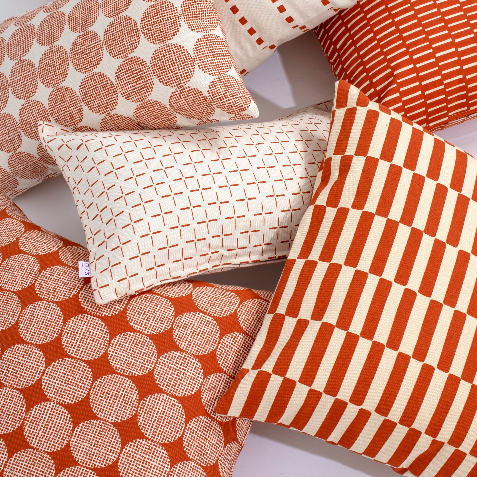 Los almohadones de CUCS están estampados sobre un tejido de algodón grueso pero muy suave al tacto. Al ser la estampación un proceso artesanal, es posible que los almohadones presenten ligeros cambios de tonalidad y en la distribución del estampado, confiriendo al producto un carácter bello y único.