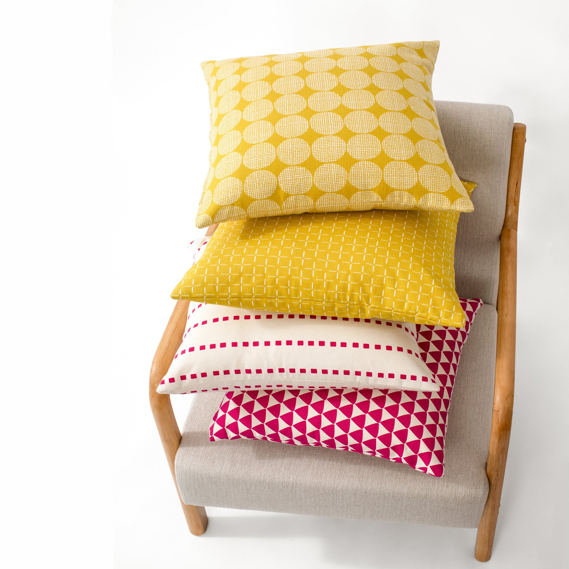 Los almohadones de CUCS están estampados sobre un tejido de algodón grueso pero muy suave al tacto. Al ser la estampación un proceso artesanal, es posible que los almohadones presenten ligeros cambios de tonalidad y en la distribución del estampado, confiriendo al producto un carácter bello y único.