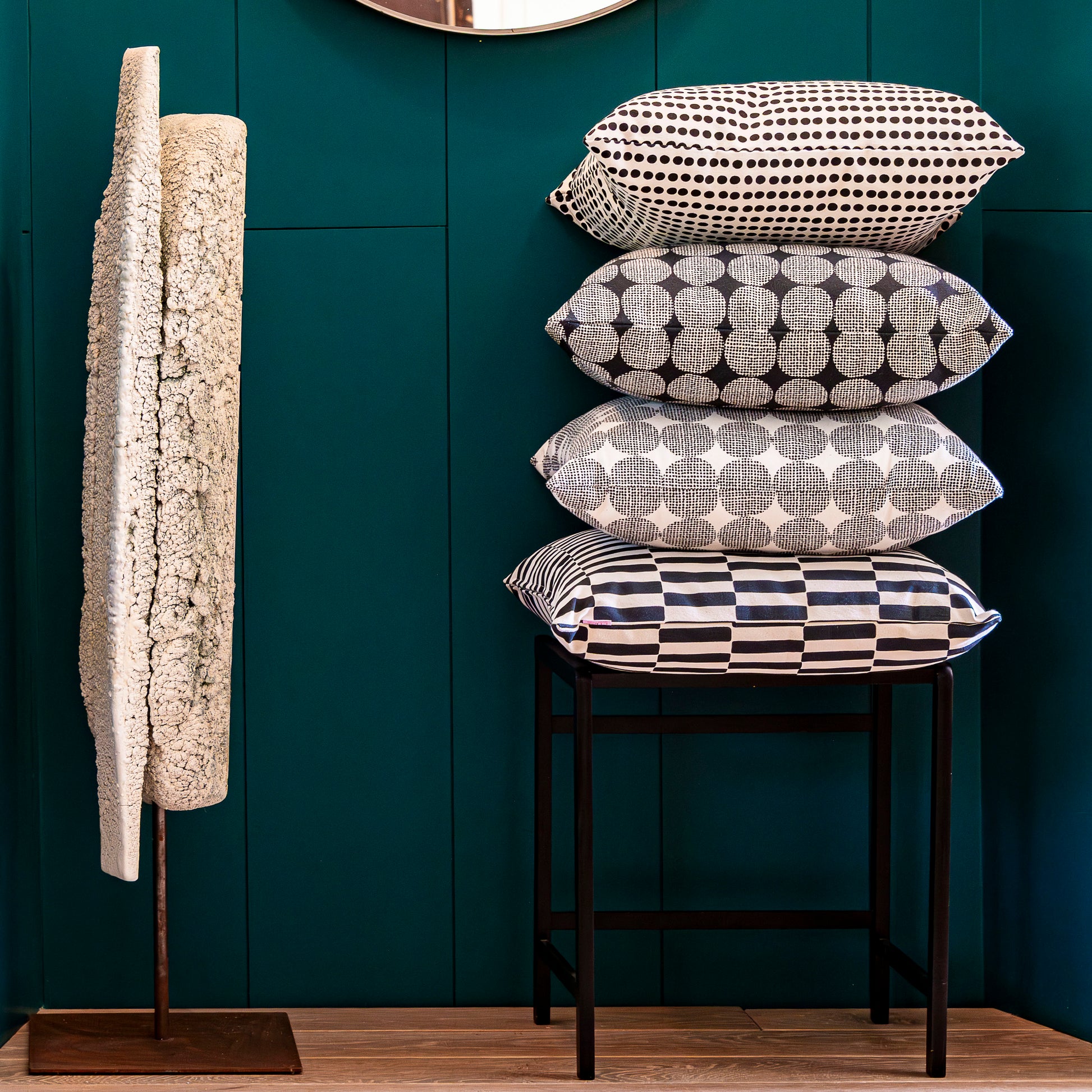 Los almohadones de CUCS están estampados sobre un tejido de algodón grueso pero muy suave al tacto. Al ser la estampación un proceso artesanal, es posible que los almohadones presenten ligeros cambios de tonalidad y en la distribución del estampado, confiriendo al producto un carácter bello y único.