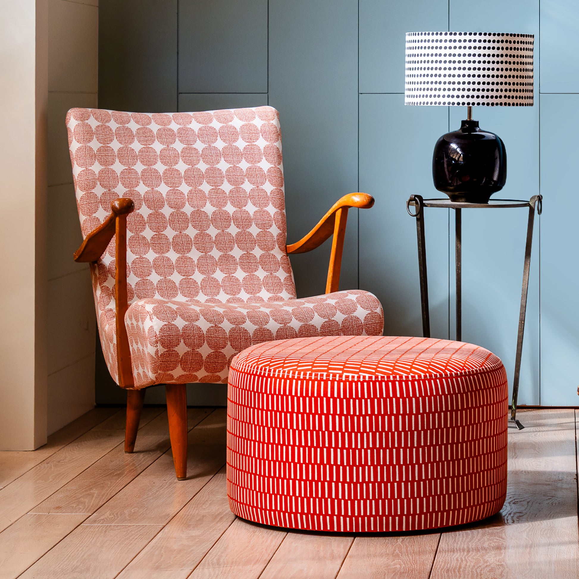 El motivo de la tela Camomila representa las diminutas flores aromáticas en forma de bolita que cubren los campos de Menorca al llegar la primavera, transformándolos en un paisaje único lleno de color y dulce olor.