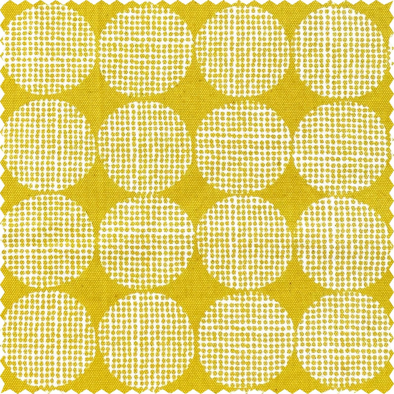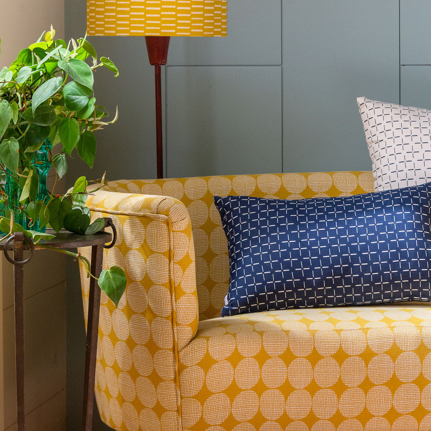 El motivo de la tela Camomila representa las diminutas flores aromáticas en forma de bolita que cubren los campos de Menorca al llegar la primavera, transformándolos en un paisaje único lleno de color y dulce olor.